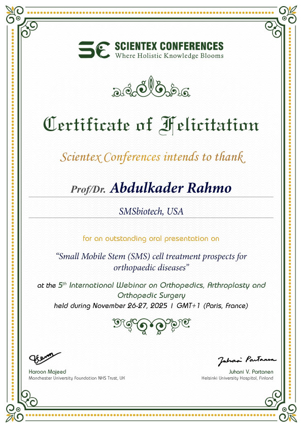 SAN DIEGO, CA — November 19, 2025 — SMSbiotech, a clinical-stage regenerative medicine company developing its proprietary Small Mobile Stem (SMS) cell platform, announced its participation in the 5th International Webinar on Orthopedics, Osteoporosis, and Musculoskeletal Disorders, held virtually from Paris, France on November 26–27, 2025.